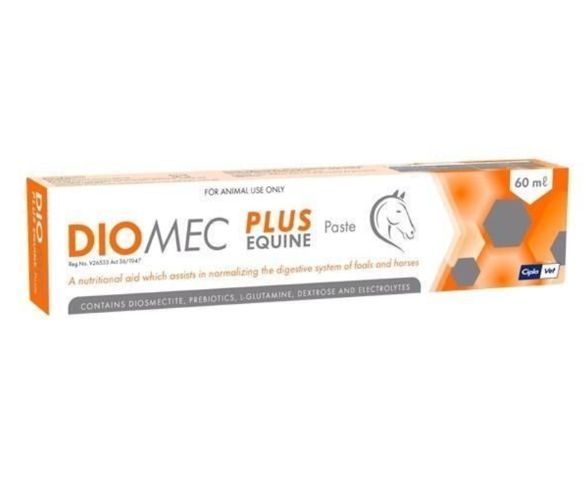 A nutritional aid which assists in normalizing the digestive system in horses suffering with diarrhoea. Diomec contains Diosmectite, which binds bacteria, toxins and water in the gut which aids in solidifying the faeces.